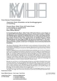 Die kostenfreie Veröffentlichung ist nur im Rahmen der aktuellen Berichterstattung erlaubt (ab 3 Monate vor Ausstellungsbeginn bis 6 Wochen nach Ende der Ausstellung). Nutzungen in Social Media sind ohne Genehmigung nicht zulässig und zudem grundsätzlich kostenpflichtig. Alle weiteren Nutzungen sind lizenz- und gebührenpflichtig. Bitte kontaktieren Sie in diesem Fall die VG Bild-Kunst direkt: reproduktionsrechte@bildkunst.de
